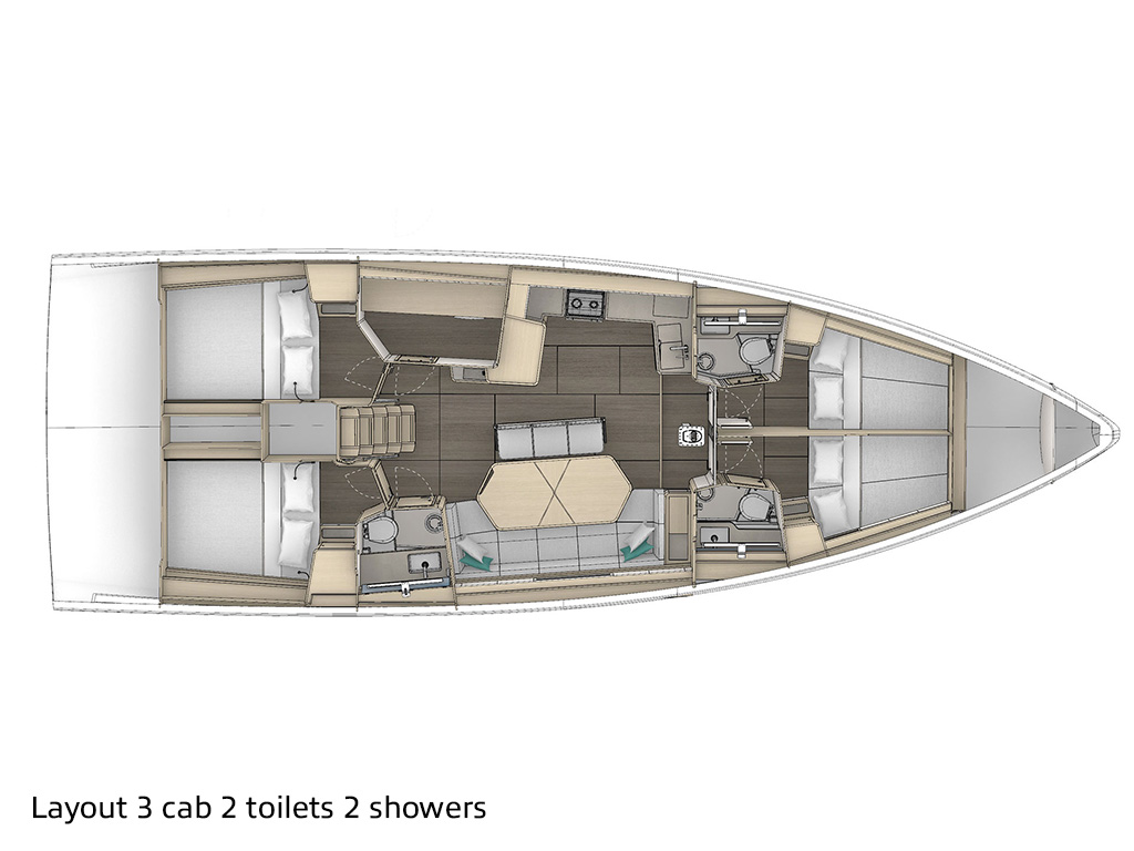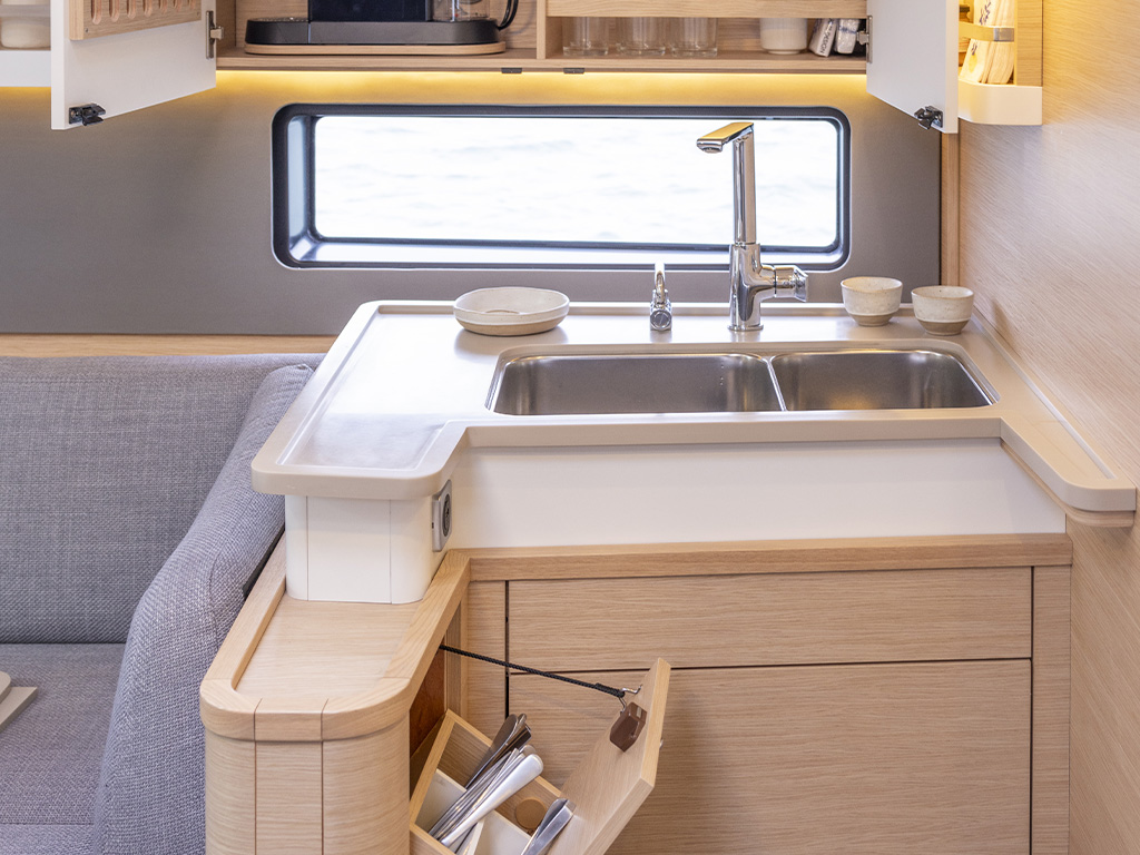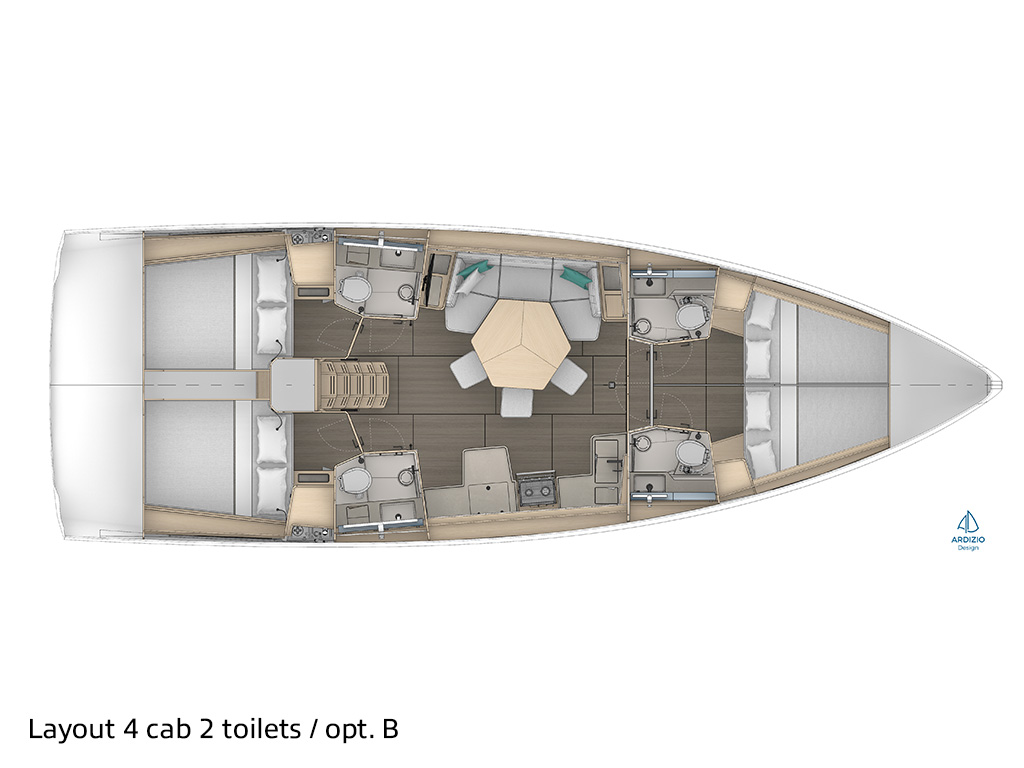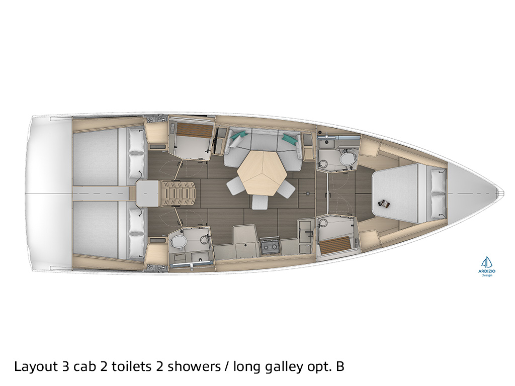 Zur Auswahl stehen vier Grundrisse – mit drei oder vier Kabinen sowie wahlweise einer seitlichen oder vorderen Pantry. Jede Variante ist auf maximalen Komfort und Effizienz im Bordalltag ausgelegt.Optimiertes Decklayout