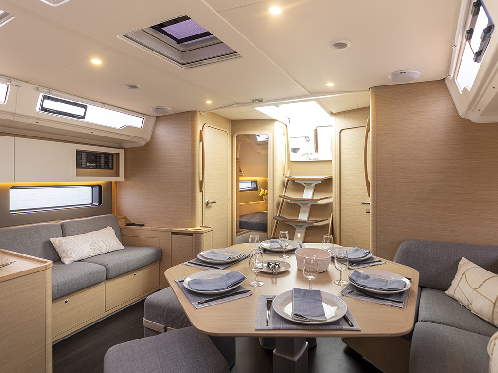 Der durchgehende Salon mit seinem einzigartigen hexagonalen Tisch bietet Platz für bis zu 10 Personen. Clevere Stauraumlösungen und viel Tageslicht schaffen eine warme, helle und funktionale Atmosphäre.Eigner-Suite