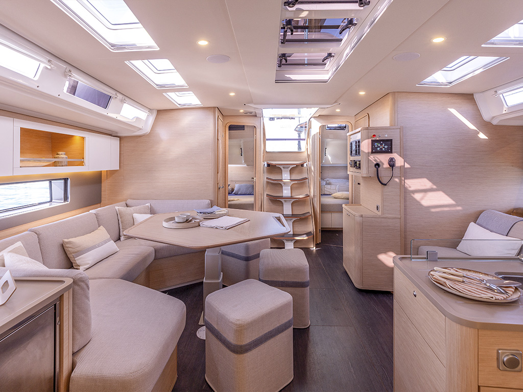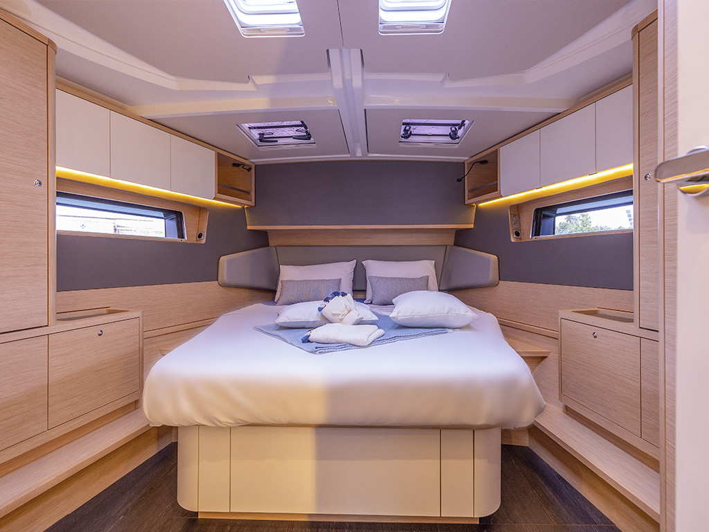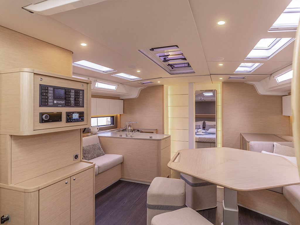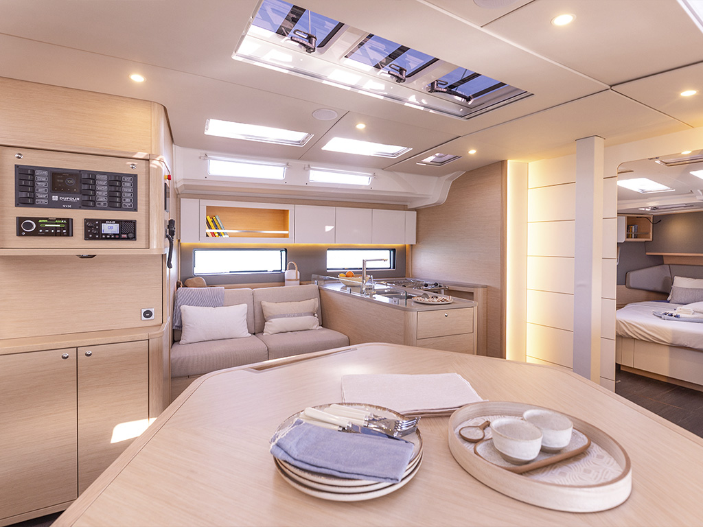 Große Fensterflächen und zusätzliche Luken sorgen für lichtdurchflutete Kabinen und einen einladenden Salon. Neueste Features wie ein TV-Liftsystem in der Eignerkabine unterstreichen den modernen Anspruch. Für Navigation und Bordelektronik setzt Dufour weiterhin auf die bewährte Partnerschaft mit B&G Electronics – Garant für Präzision und Zuverlässigkeit. Zwei separate Sonnendecks schaffen zusätzliche Erholungszonen. Im Vorschiffscockpit lassen sich die Tische absenken und verwandeln den Bereich in eine großzügige Liegefläche. Am Bug entsteht darüber hinaus ein zweites Sonnendeck auf dem Kajütaufbau – ein einzigartiger Platz, um Sonne und Meer inmitten der Segel zu genießen.Unvergleichlicher Segelkomfort