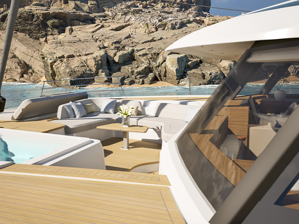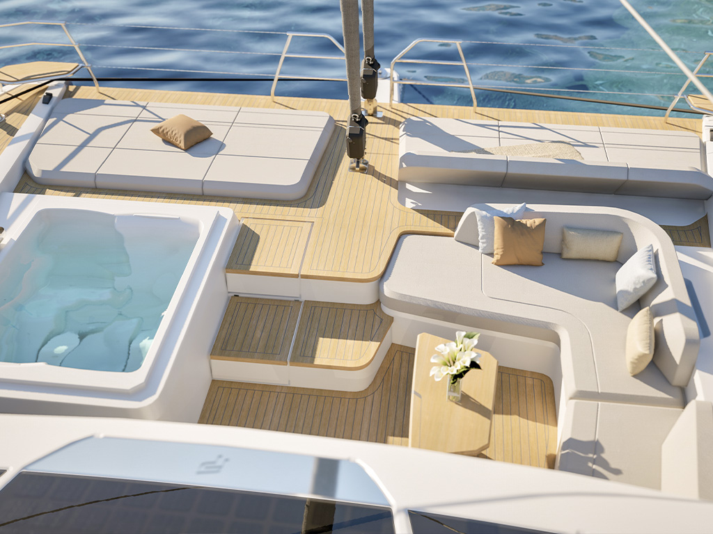 Aft Beach Club – hydraulic platform, sunbeds, and generous storage for water sports equipment