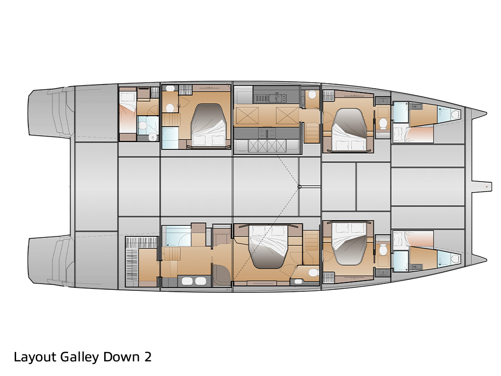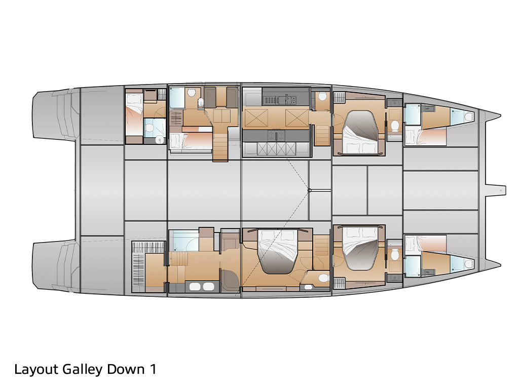 • 5 guests (galley below): 5 double cabins + 5 bathrooms