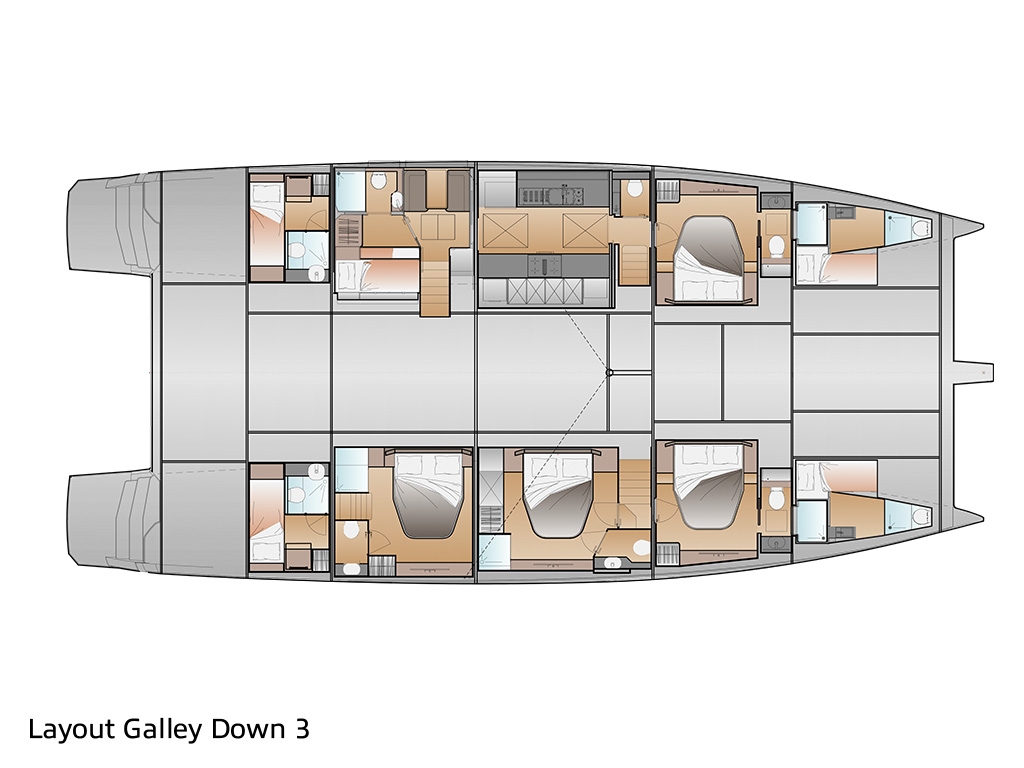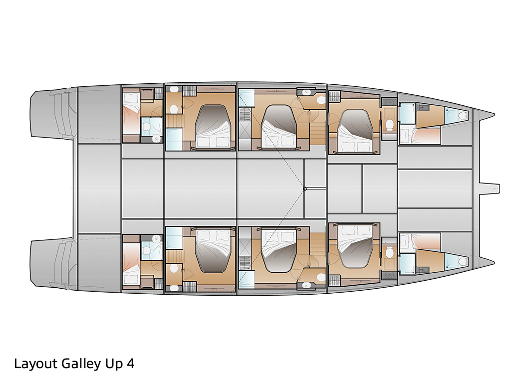 • 6 guests (galley above): 6 double cabins + 4 bathrooms