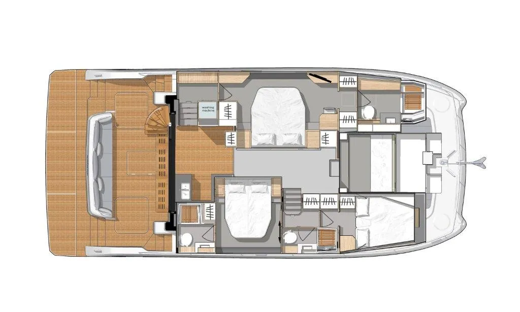 The entire port hull is reserved for the owner with his spacious owner's cabin and large bathroom. The starboard hull houses two VIP double cabins, each with its own bathroom. In the forward saloon area, next to the helm station, there is a large storage area enclosed by a door, which can optionally be converted into a sleeping cabin for the skipper, for example.