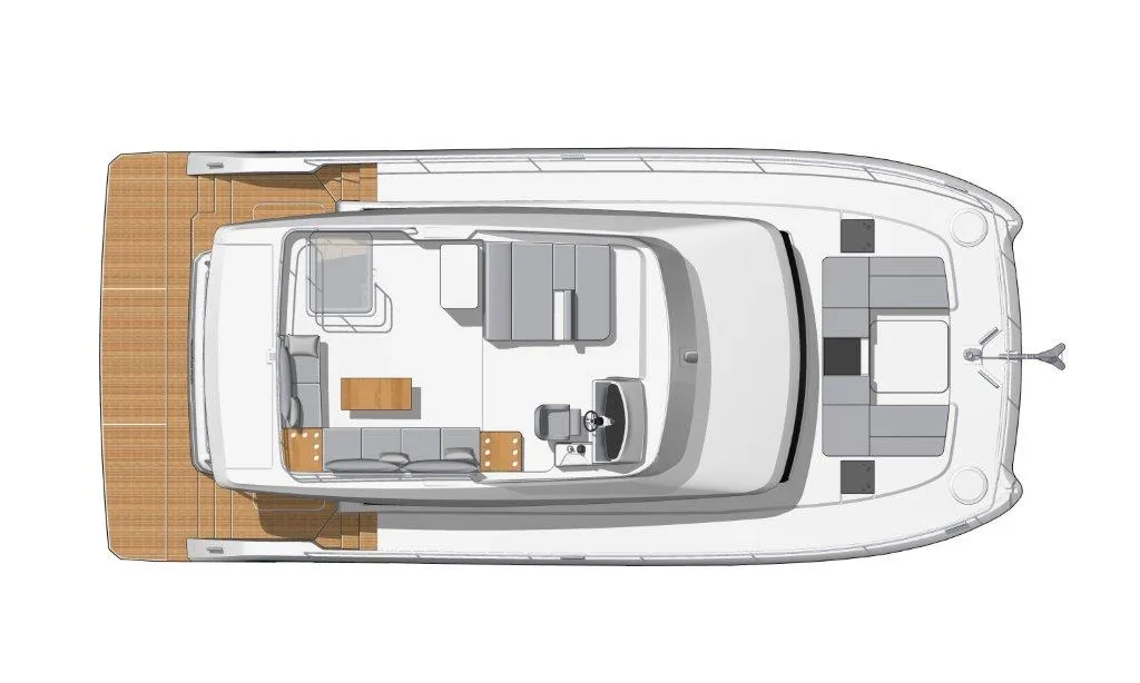 - Flybridge with sun loungers next to the steering position, outdoor kitchen and large dining and lounge area