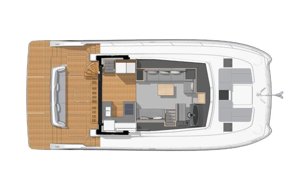 With the Fountaine Pajot MY6, designer PierAngelo Andreani has succeeded in offering the same luxurious living space as a 20-meter monohull flybridge motor yacht over a length of 15 meters, both inside and out. The living space on board is reminiscent of a vacation home with a loft character and large terrace areas at the bow and stern. On top is a huge flybridge with an outdoor kitchen and magnificent panoramic views. With its semi-planing hulls, this Fountaine Pajot MY6 motor catamaran also offers exceptionally good handling characteristics for fast and stable cruising with moderate fuel consumption. Equipped with the Volvo 500 or 600 IPS system, the Fountaine Pajot MY6 is easy to maneuver as it can move sideways with a simple push of the joystick. You retain full control from both helm stations (in the saloon and on the flybridge) in all weather conditions.