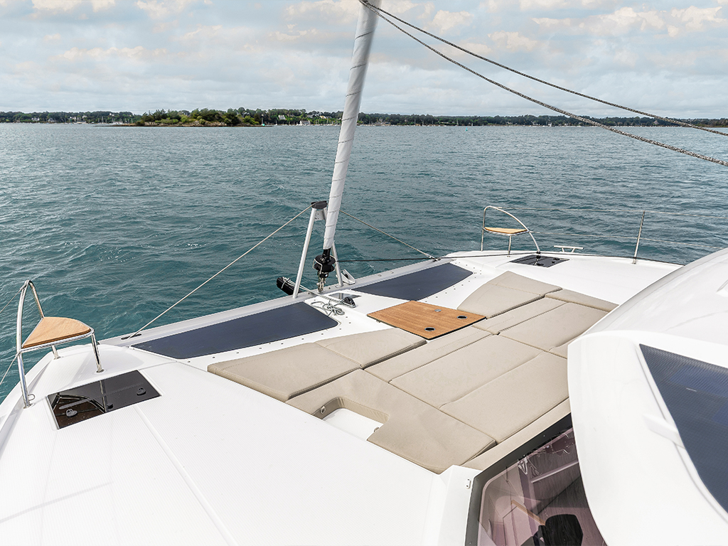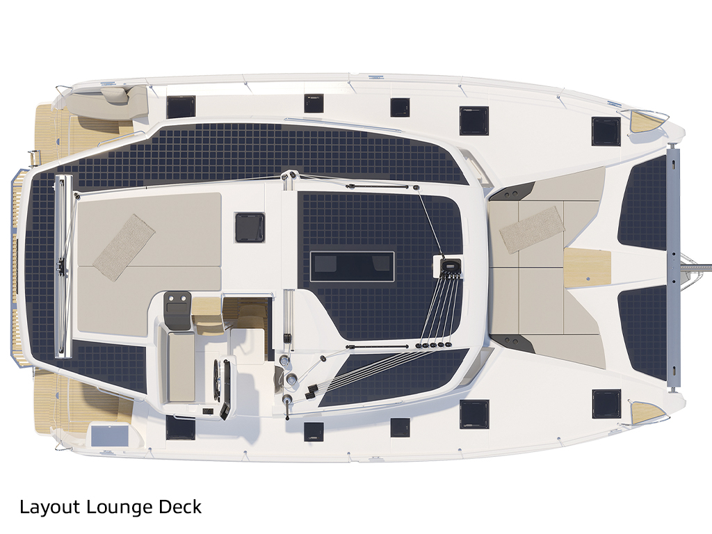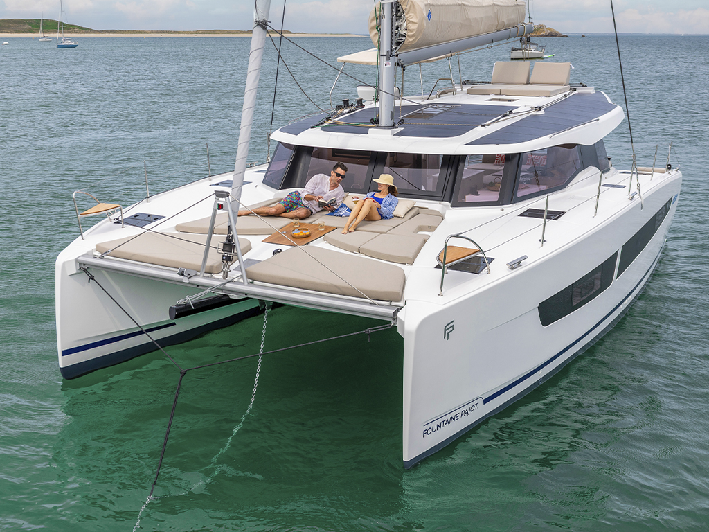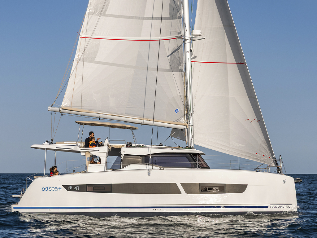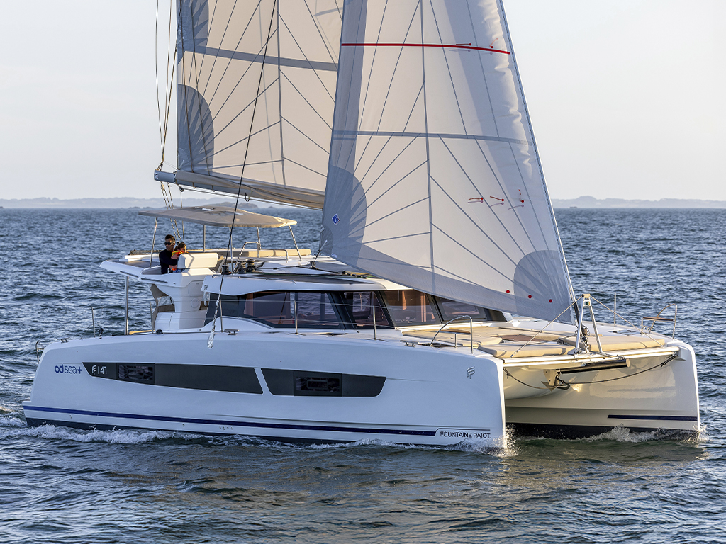 The new Fountaine Pajot FP41 represents a generation of catamarans that sail further, longer and more sustainably – in perfect harmony with the ocean. Whether powered by a classic combustion engine or modern electric drive, this 12-metre catamaran has been designed to offer maximum autonomy and comfort on all seas. Safe, elegant and seaworthy, it accompanies its crew wherever adventure takes them. The FP41 harmoniously combines elegance, performance and living space. Its design, with clean, horizontal lines, gives the 41-foot catamaran a gracefulness that is otherwise reserved for significantly larger models. Thanks to its generous sail plan, it sails swiftly and stably over long distances – while remaining easy to manoeuvre near the coast. The proven dual helm concept ensures optimum visibility and intuitive handling. Newly designed lounge areas – such as sun loungers on the bimini, in the bow and even integrated into the stern – create exclusive retreats on board. Every area on board has been carefully designed to ensure maximum comfort both underway and at anchor. The bright saloon with three large windows opens completely to the aft cockpit. A large hatch connects the galley and the foredeck, creating an open, communicative feeling of space. At the helm, the skipper enjoys an unobstructed view of the horizon – while still remaining in contact with the crew in the cockpit or on the sun deck.Special features of the Fountaine Pajot FP41