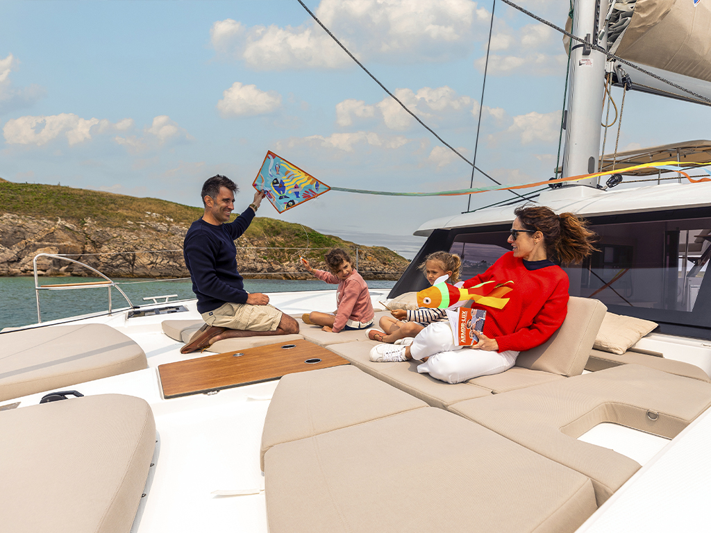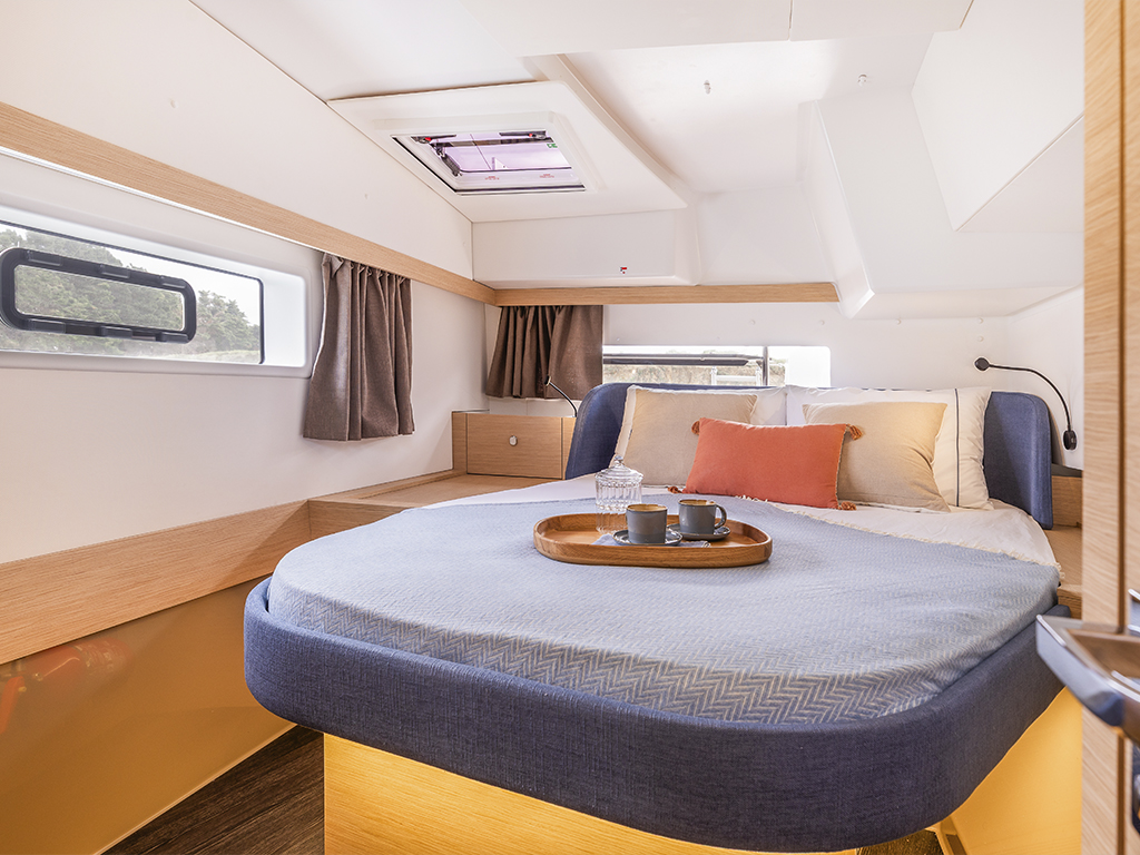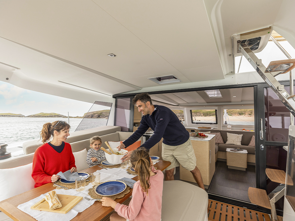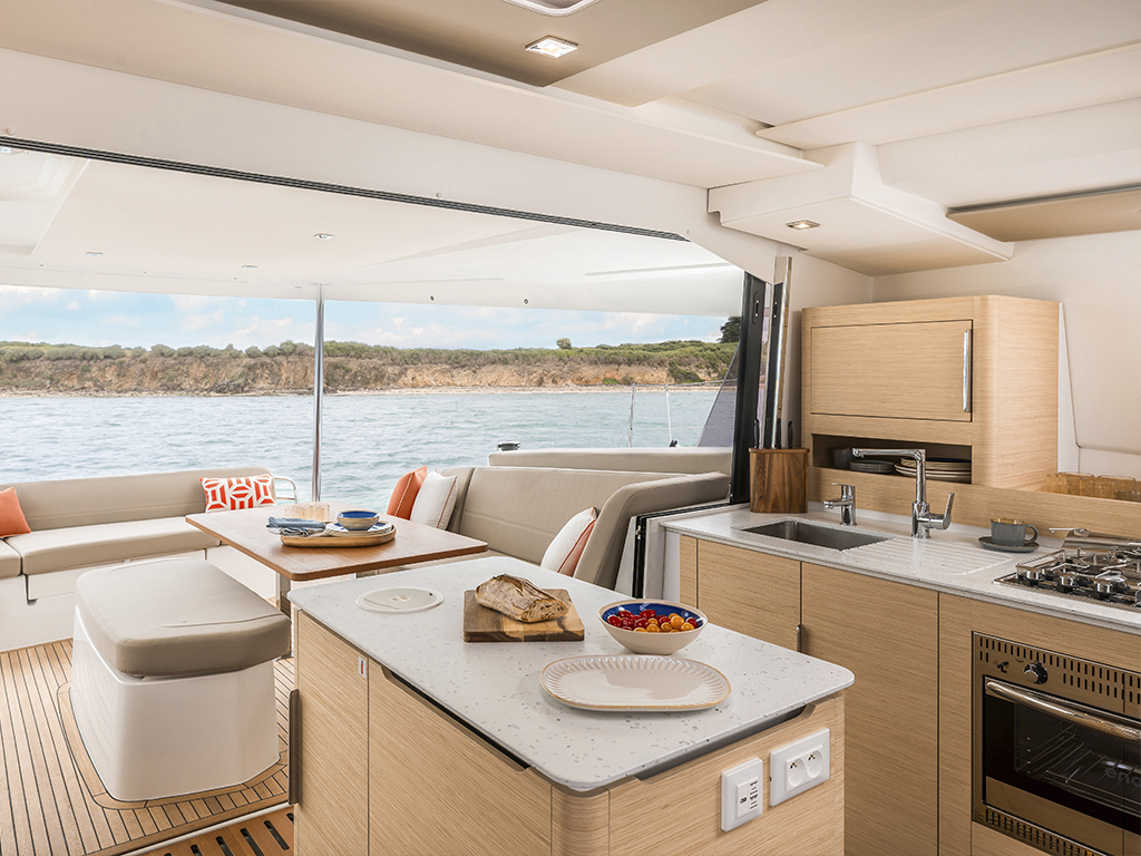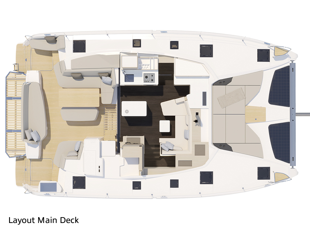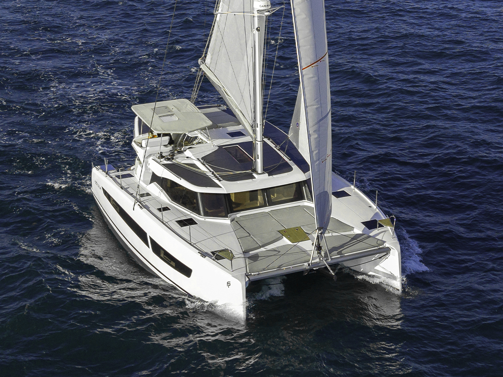 The new Fountaine Pajot FP41 represents a generation of catamarans that sail further, longer and more sustainably – in perfect harmony with the ocean. Whether powered by a classic combustion engine or modern electric drive, this 12-metre catamaran has been designed to offer maximum autonomy and comfort on all seas. Safe, elegant and seaworthy, it accompanies its crew wherever adventure takes them. The FP41 harmoniously combines elegance, performance and living space. Its design, with clean, horizontal lines, gives the 41-foot catamaran a gracefulness that is otherwise reserved for significantly larger models. Thanks to its generous sail plan, it sails swiftly and stably over long distances – while remaining easy to manoeuvre near the coast. The proven dual helm concept ensures optimum visibility and intuitive handling. Newly designed lounge areas – such as sun loungers on the bimini, in the bow and even integrated into the stern – create exclusive retreats on board. Every area on board has been carefully designed to ensure maximum comfort both underway and at anchor. The bright saloon with three large windows opens completely to the aft cockpit. A large hatch connects the galley and the foredeck, creating an open, communicative feeling of space. At the helm, the skipper enjoys an unobstructed view of the horizon – while still remaining in contact with the crew in the cockpit or on the sun deck.Special features of the Fountaine Pajot FP41