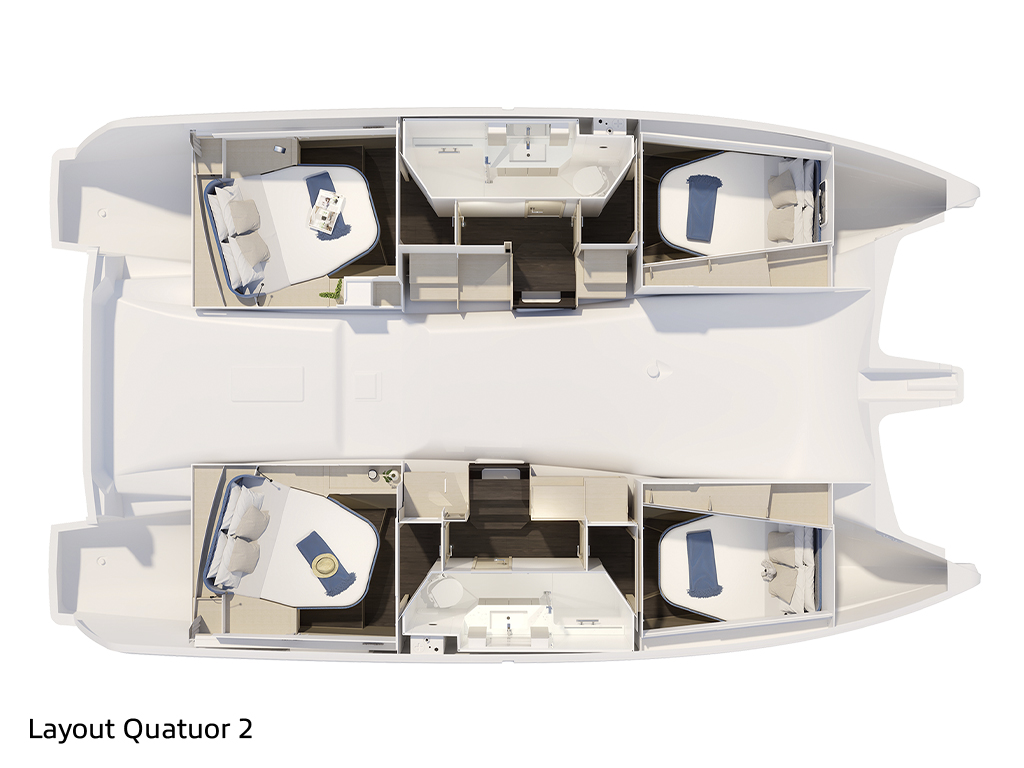 • Quatuor 2 version: 4 double cabins + 2 bathrooms / skipper's cabin