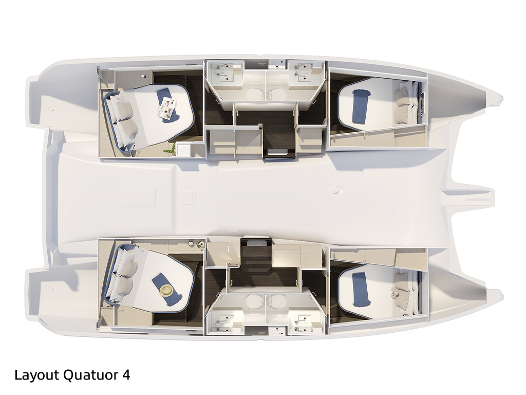 • Quatuor 4 version: 4 double cabins + 4 bathrooms / skipper's cabin