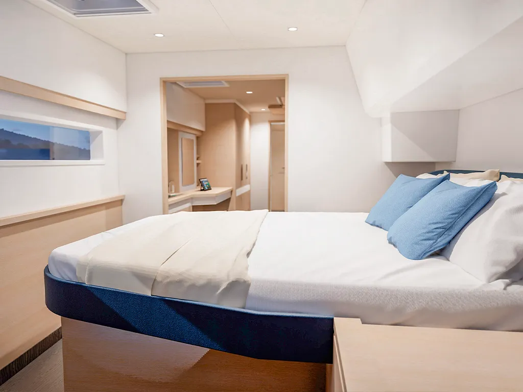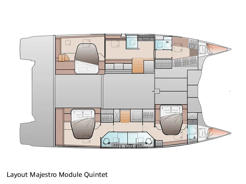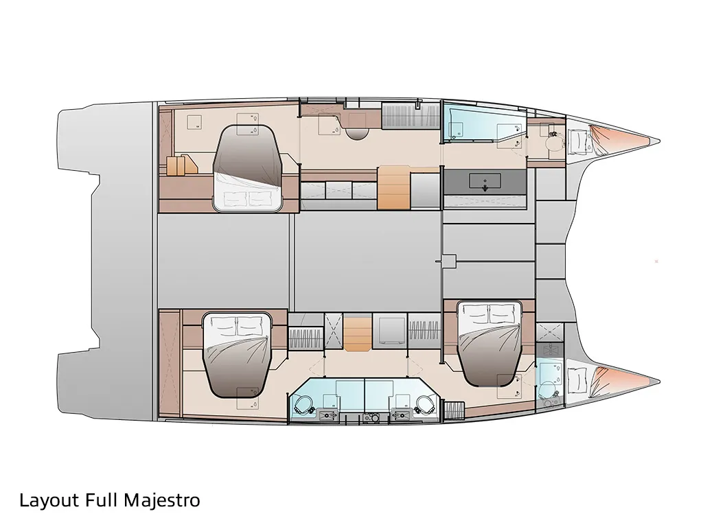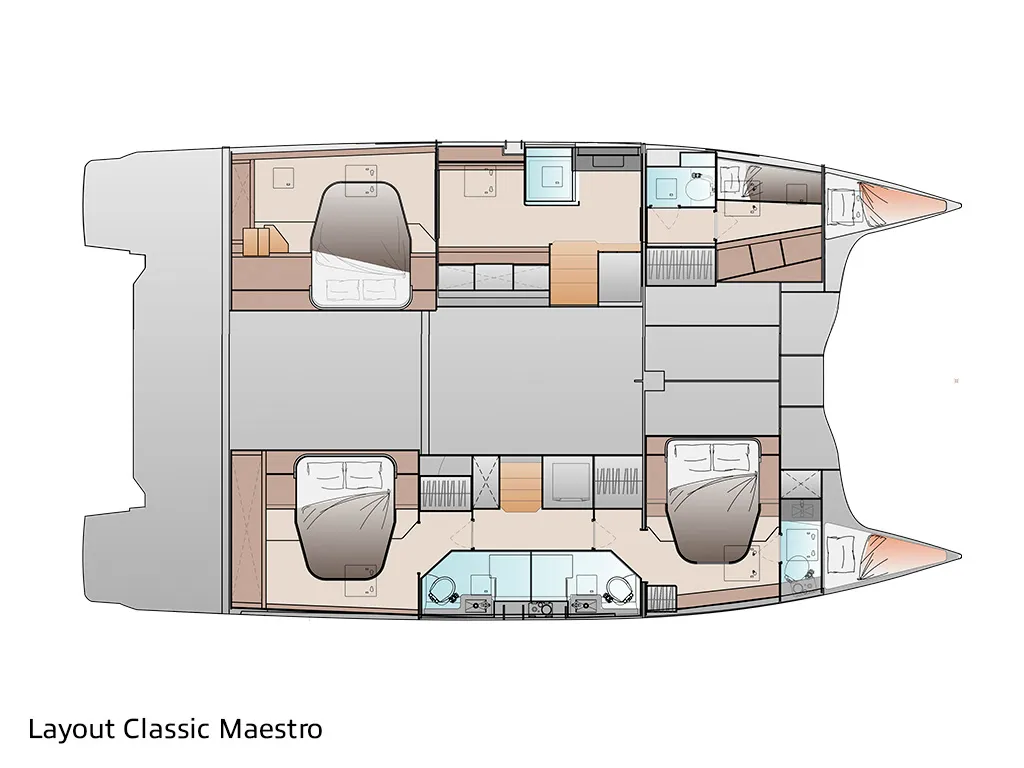 • Classic Maestro: 1 owner's suite + multifunctional room or dressing room / 2 double cabins + 2 bathrooms • Full Maestro: 1 owner's suite / 2 double cabins + 2 bathrooms • Quintet: 4 double cabins + 4 bathrooms + 1 bunk cabin with bathroomA catamaran for every crew size – 3 or 4 cabins and up to 10 berths