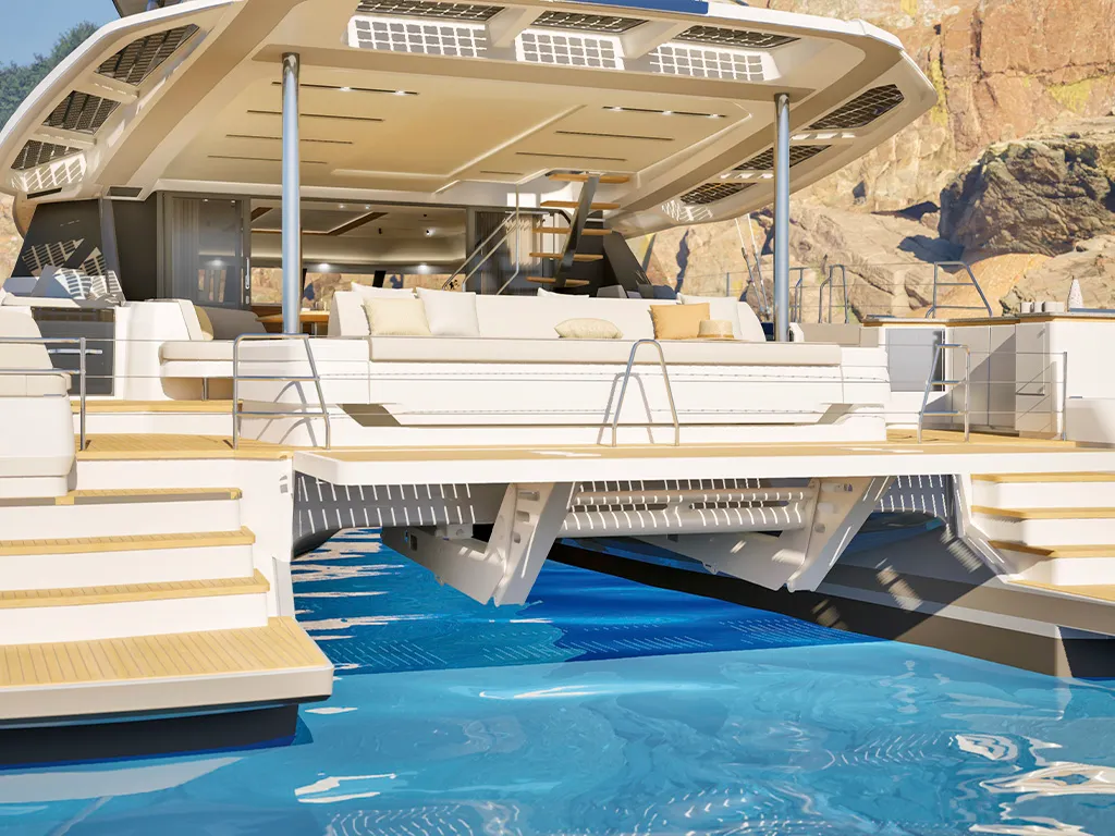 Beach club at the stern – hydraulic bathing platform, sun loungers, and storage space for water sports equipment