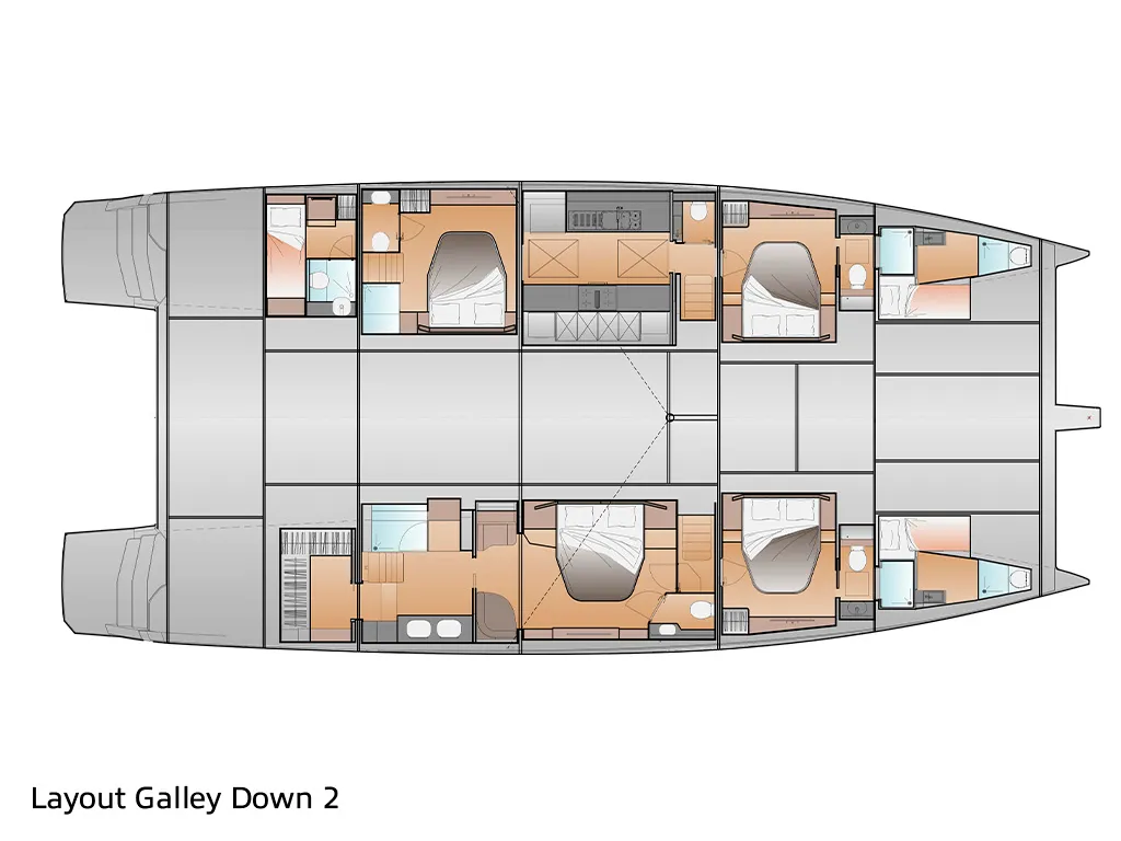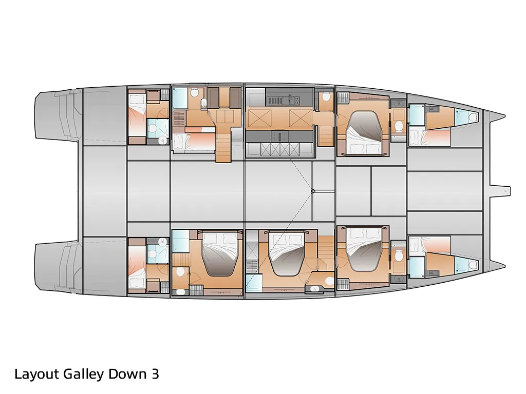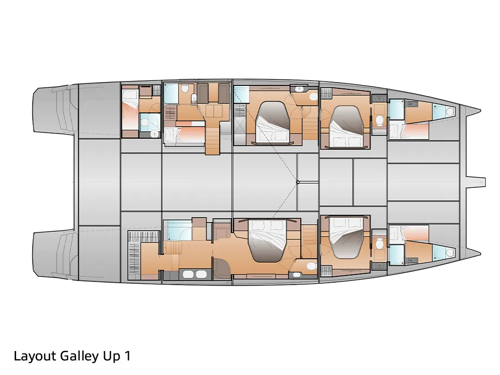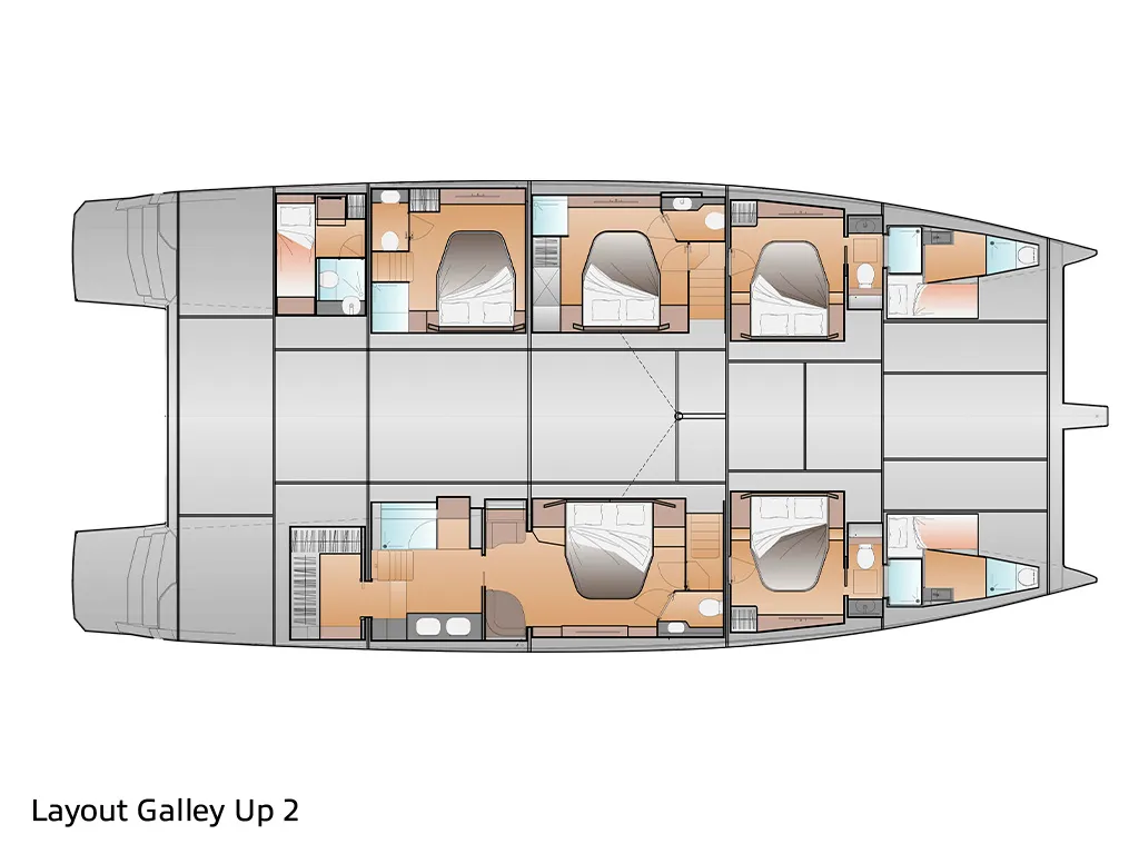 • Maestro 2 guests (galley below): 1 owner's suite + bathroom / 1 double cabin + 3 bathrooms • Maestro 3 guests (galley below): 1 owner's suite + bathroom / 3 double cabins + 3 bathrooms • 4 guests (galley below): 4 double cabins + 4 bathrooms • 5 guests (galley below): 5 double cabins + 5 bathrooms • Maestro 3 guests (galley above): 1 owner's suite + bathroom / 3 double cabins + 3 bathrooms • Maestro 4 guests (galley upstairs): 1 owner's suite + bathroom / 4 double cabins + 4 bathrooms • 5 guests (galley upstairs): 5 double cabins + 5 bathrooms • 6 guests (galley upstairs): 6 double cabins + 4 bathroomsTechnical Specifications