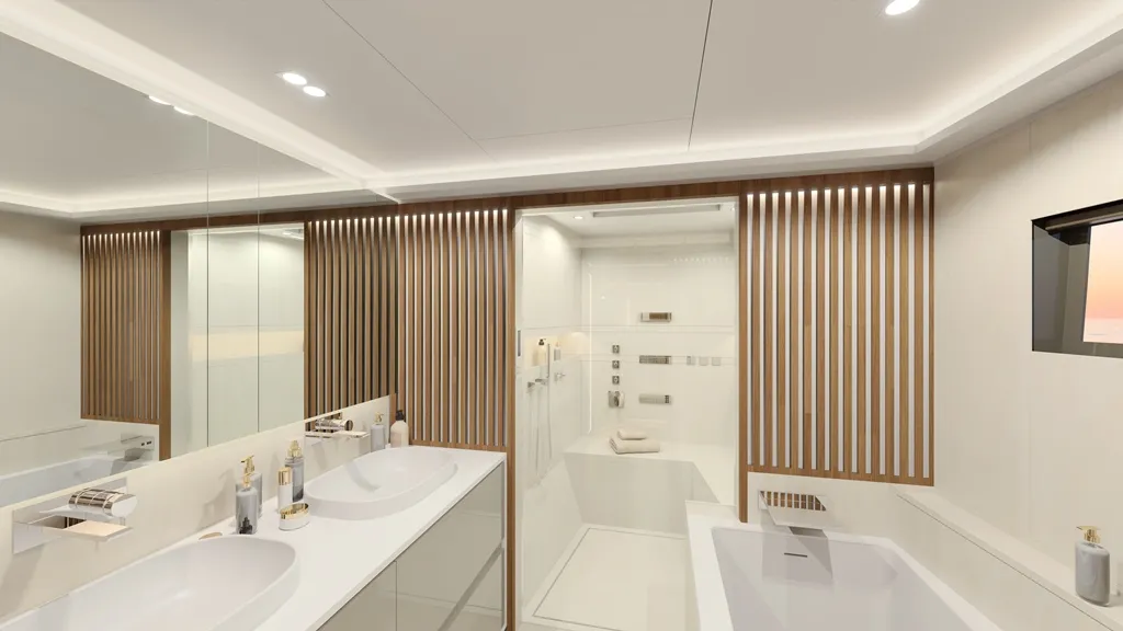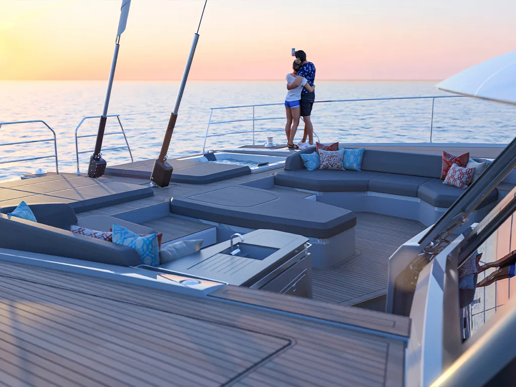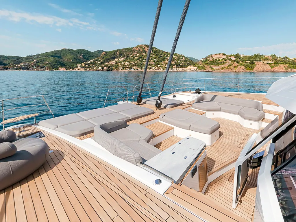 The modern interior design can be individually adapted to your needs and preferences with two different saloon layout variants and three different cabin layout variants, as well as three different high-quality wood designs. The owner's cabin can also be equipped with its own spa. On both sides of the yacht, semi-glazed side walls can also be opened at the stern to further enlarge the cockpit area. The large hydraulic bathing platform at the stern also supports large tenders weighing more than 700 kg and a jet ski can be stored in the garage.