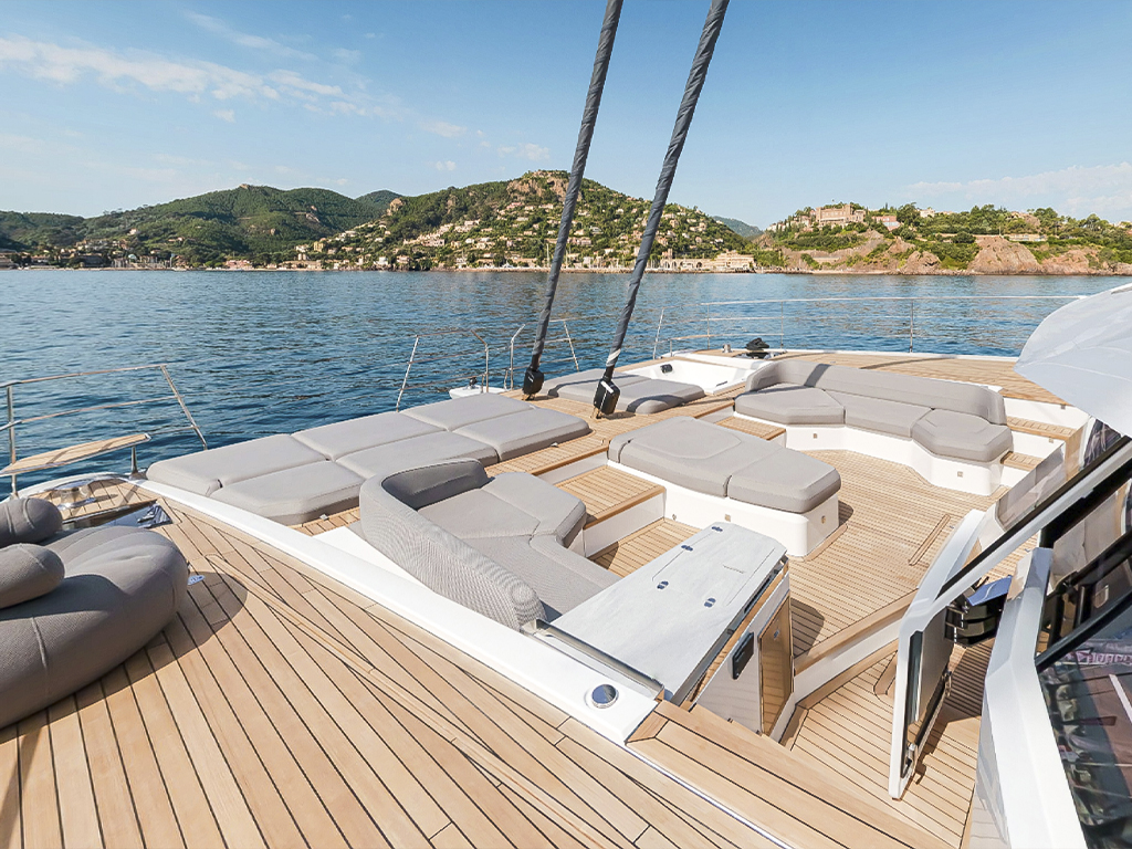 - Generous living space: With a length of 24 meters, the Thíra 80 offers spacious indoor and outdoor areas. The well thought-out layout allows for a luxurious lifestyle on board, from the comfortable cabins to the stylish saloon where you can enjoy the panoramic sea view.