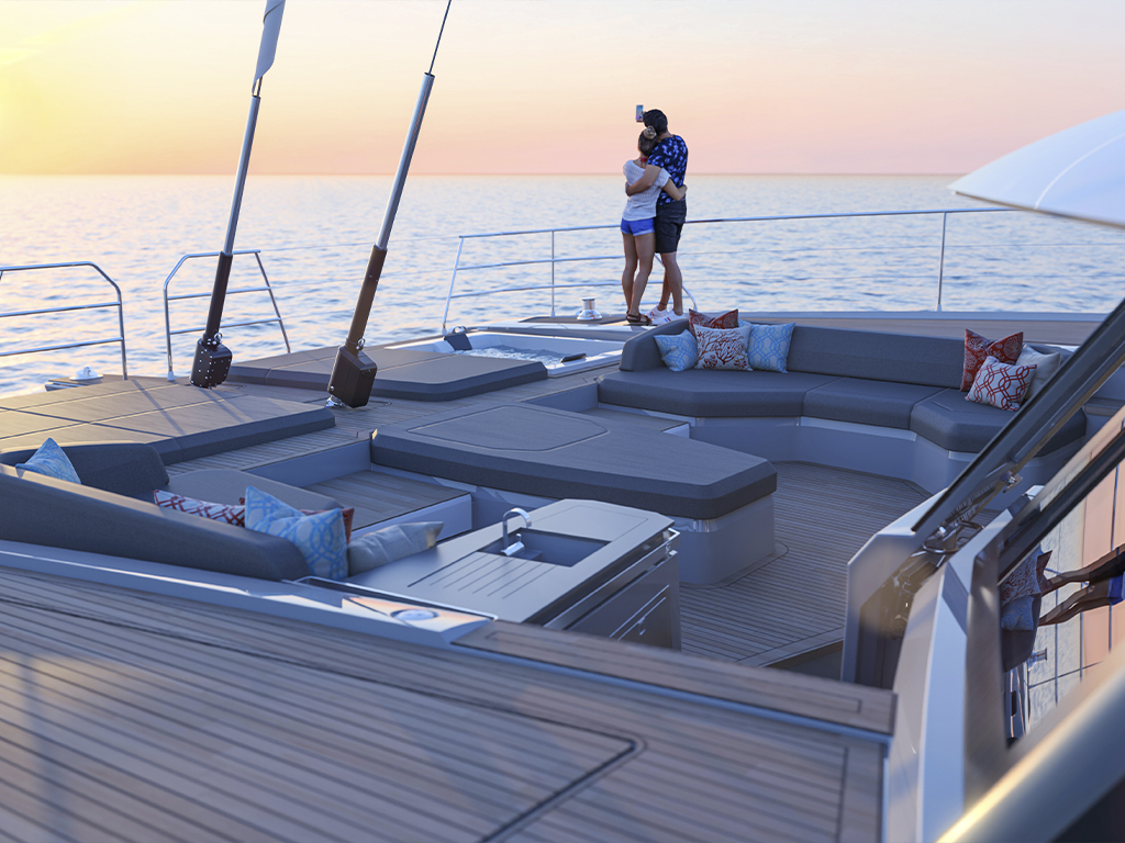 The modern interior design can be individually adapted to your needs and preferences with two different saloon layout variants and three different cabin layout variants, as well as three different high-quality wood designs. The owner's cabin can also be equipped with its own spa. On both sides of the yacht, semi-glazed side walls can also be opened at the stern to further enlarge the cockpit area. The large hydraulic bathing platform at the stern also supports large tenders weighing more than 700 kg and a jet ski can be stored in the garage.