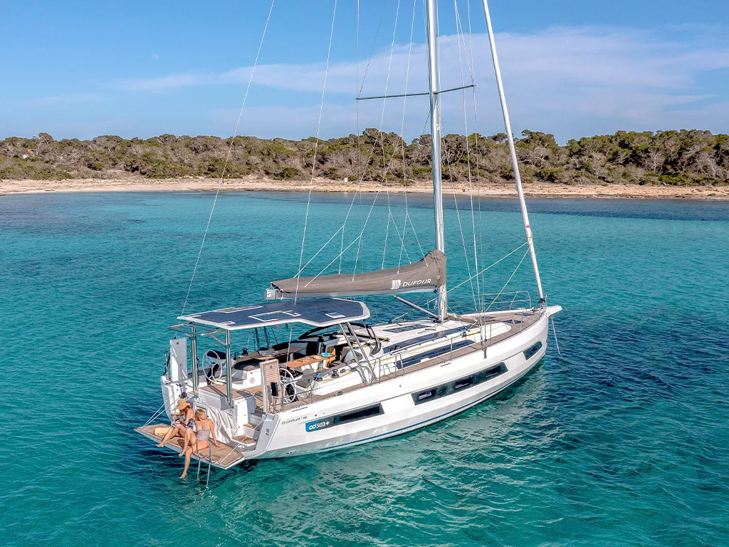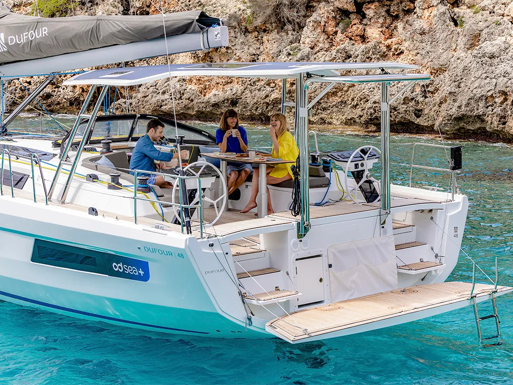 El Dufour 48 convence por su diseño bien pensado: una amplia plataforma de baño con dos accesos, mesas de bañera divididas para mayor libertad de movimiento, cubiertas laterales seguras y una bañera ordenada. Opcionalmente, un elegante techo rígido protege del sol y las salpicaduras. Con 15 metros de eslora y 5 metros de manga, el Dufour 48 impresiona por su extraordinaria amplitud. En el interior se puede elegir entre dos variantes de cocina (delantera o lateral) y configuraciones flexibles de camarotes con tres o cuatro camarotes. Cada variante está diseñada para ofrecer el máximo confort y optimizar el espacio.Innovación y tecnología