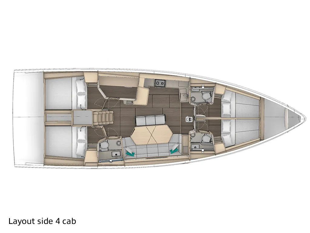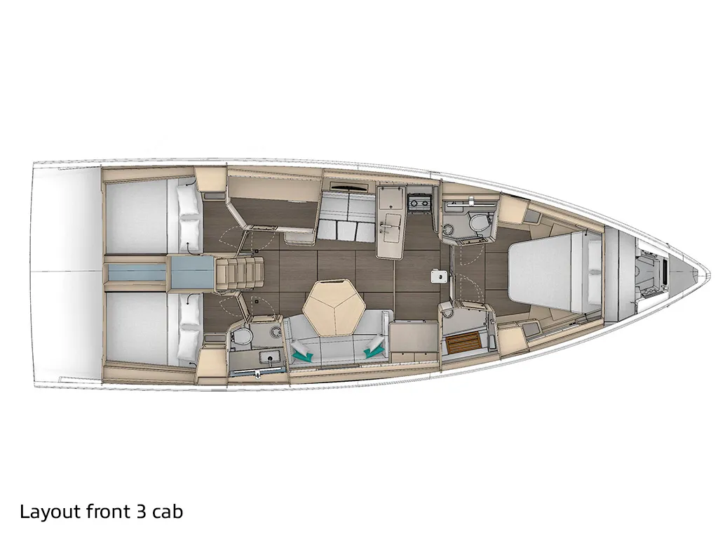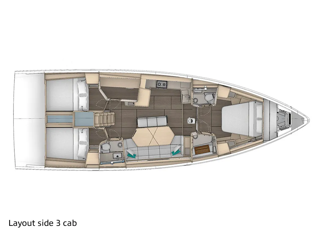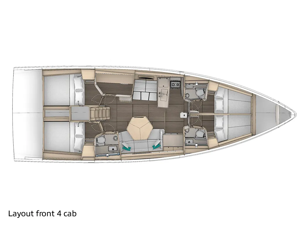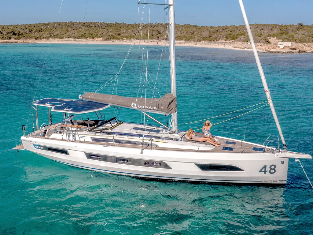 En el mar, el Dufour 48 convence por su extraordinaria estabilidad y las características de navegación típicas que hacen tan populares a los yates Dufour. Las amplias zonas de asiento y una posición de timón bien pensada contribuyen además a una experiencia de navegación relajada y segura. Con su característico timón único, convence por su excelente maniobrabilidad y su respuesta directa al timón. Esbelto, apto para la navegación y dinámico, encarna los valores que caracterizan a Dufour: experiencias de navegación incomparables.Datos técnicos