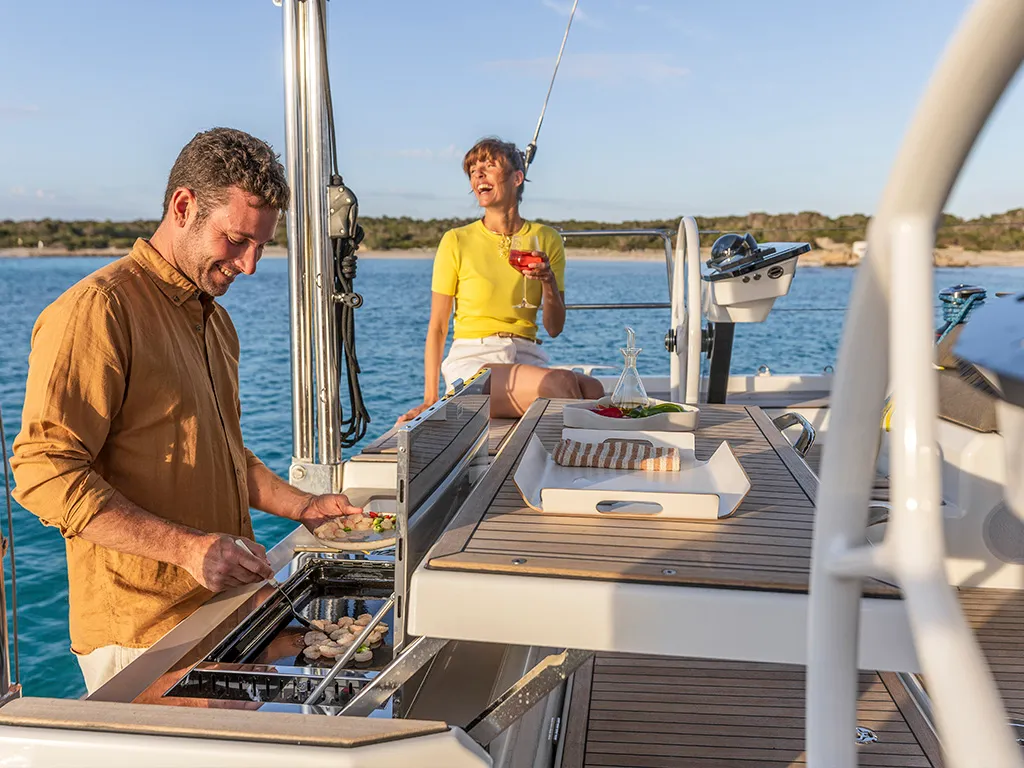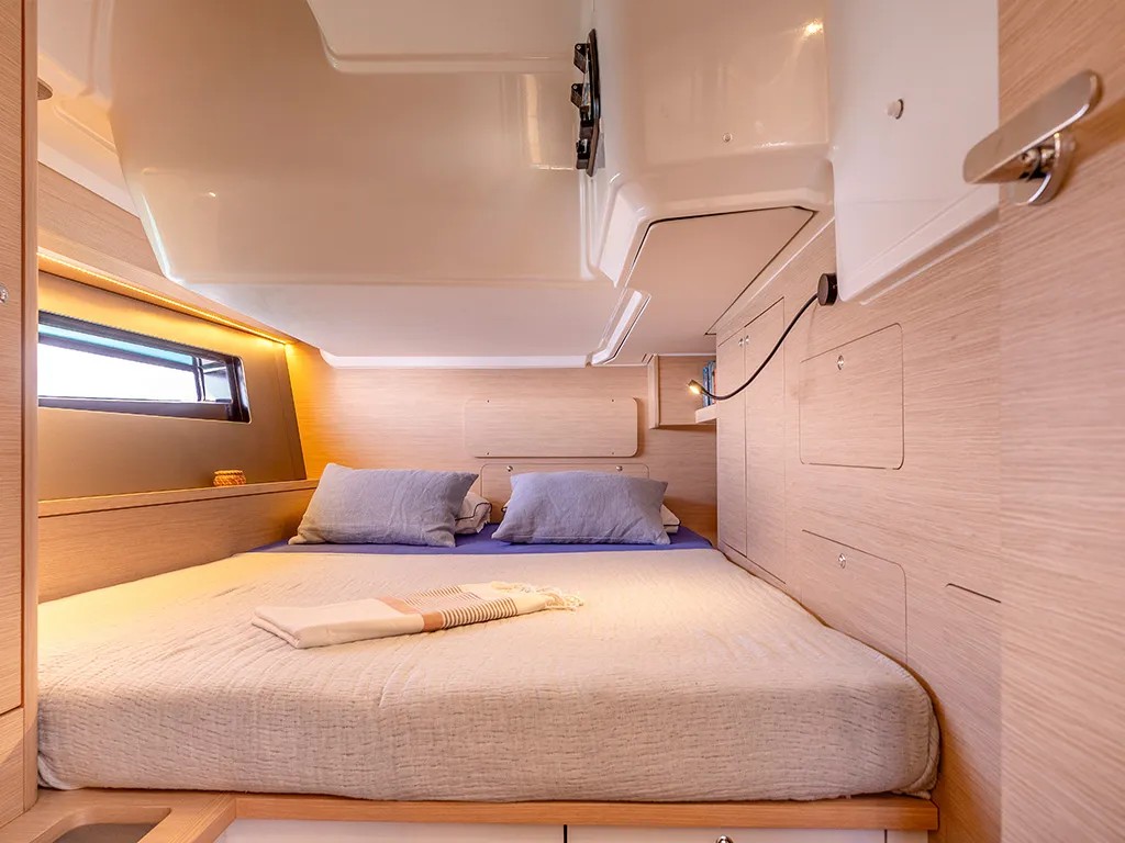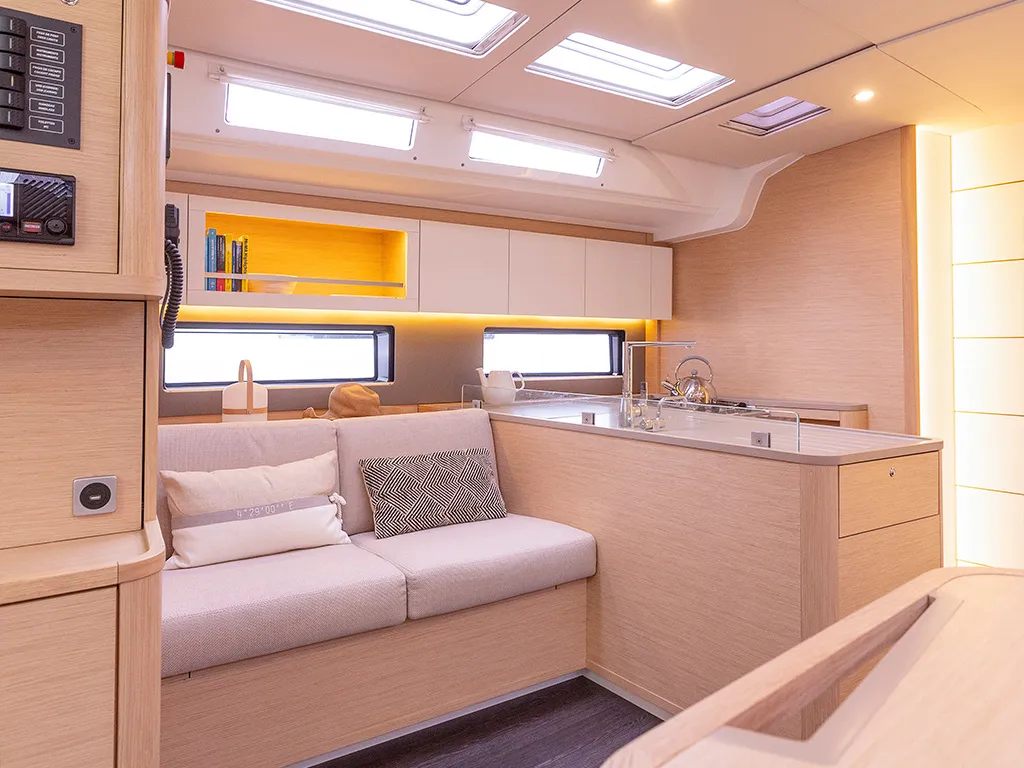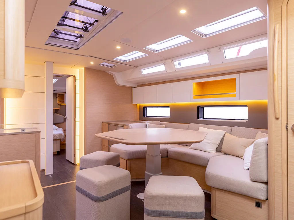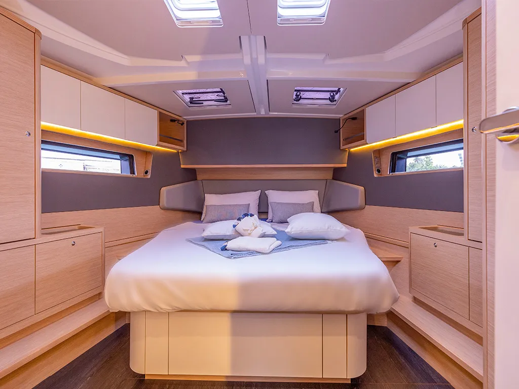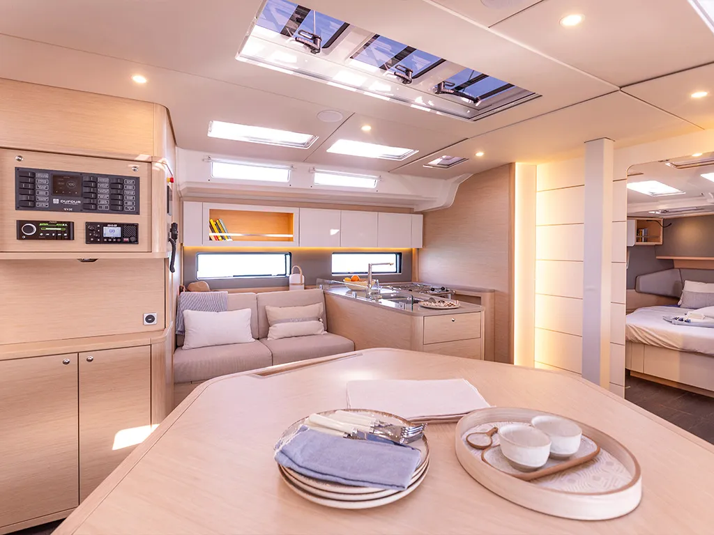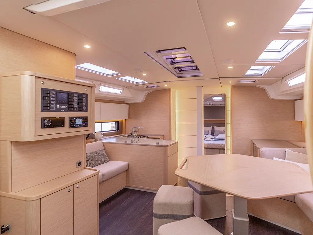 Las grandes superficies acristaladas y las escotillas adicionales garantizan camarotes luminosos y un salón acogedor. Las últimas novedades, como un sistema de elevación de televisores en el camarote del propietario, subrayan su carácter moderno. Para la navegación y la electrónica de a bordo, Dufour sigue apostando por su probada colaboración con B&G Electronics, garantía de precisión y fiabilidad. Dos cubiertas separadas crean zonas de descanso adicionales. En la bañera de proa, las mesas se pueden bajar y convertir la zona en una amplia superficie para tomar el sol. En la proa hay además una segunda cubierta para tomar el sol sobre la superestructura de la cabina, un lugar único para disfrutar del sol y el mar en medio de la navegación.Comodidad de navegación incomparable
