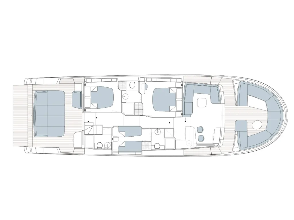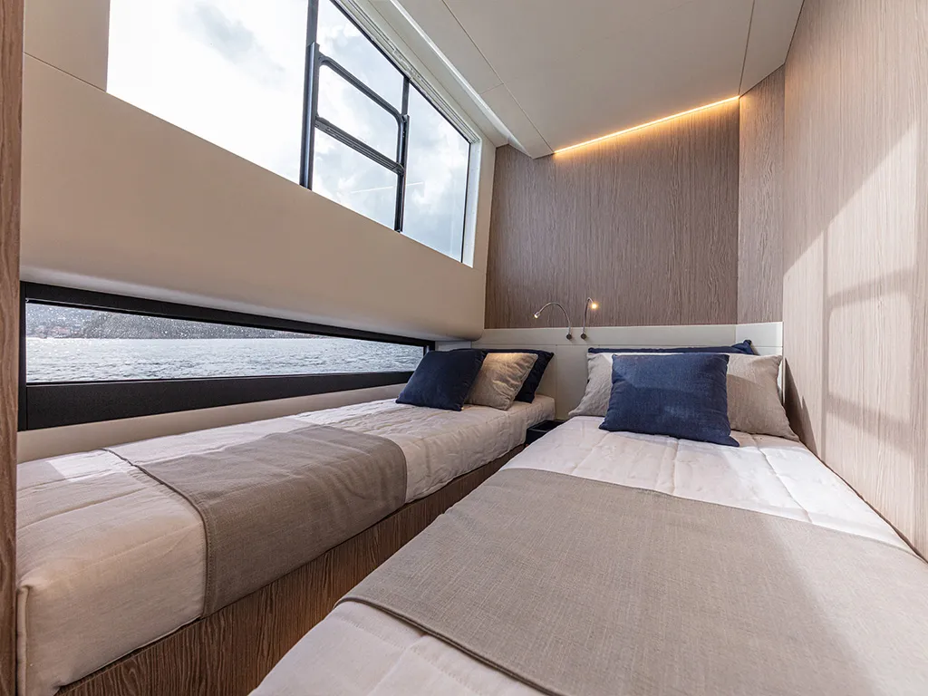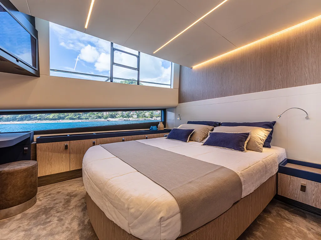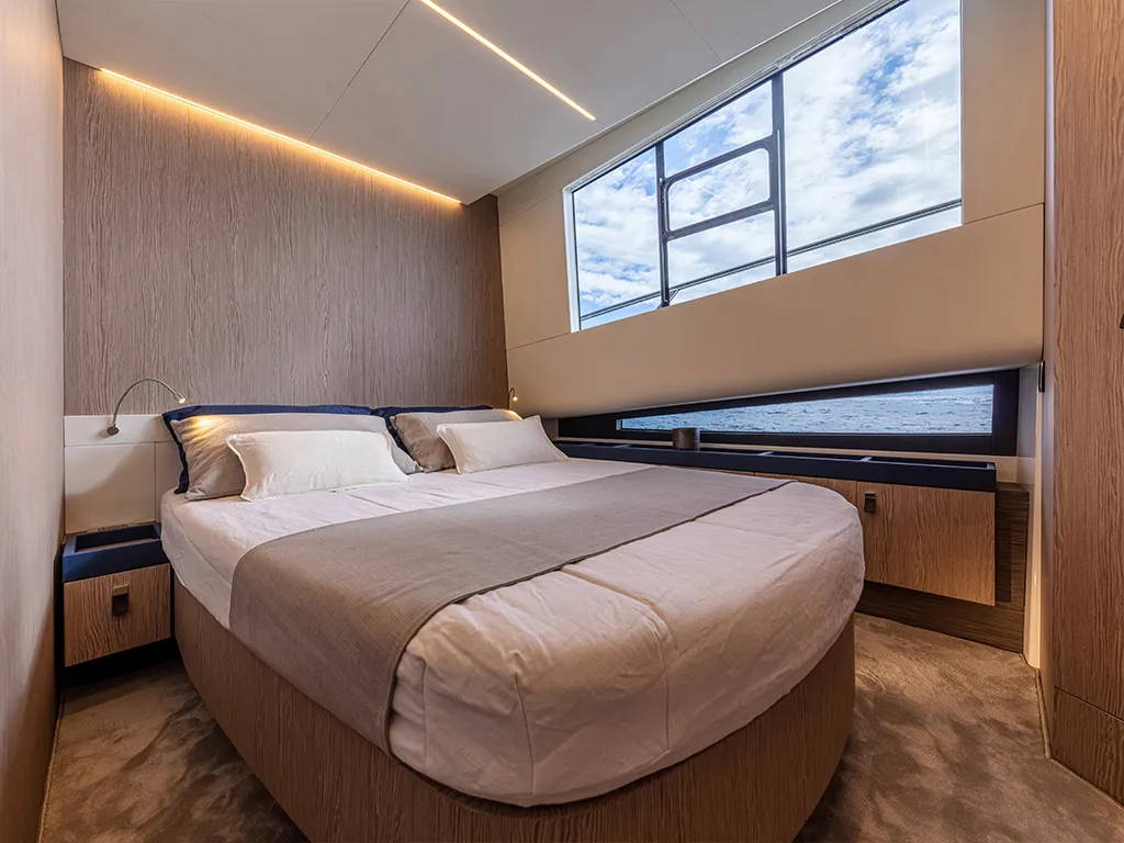 - Interior espacioso: El interior del Cetera 60 rezuma lujo y confort. Camarotes espaciosos, materiales de alta calidad y una distribución de las habitaciones bien pensada, con todos los camarotes en la cubierta principal, crean un ambiente acogedor para propietarios e invitados. El Cetera 60 puede equiparse con 3 ó 4 camarotes.