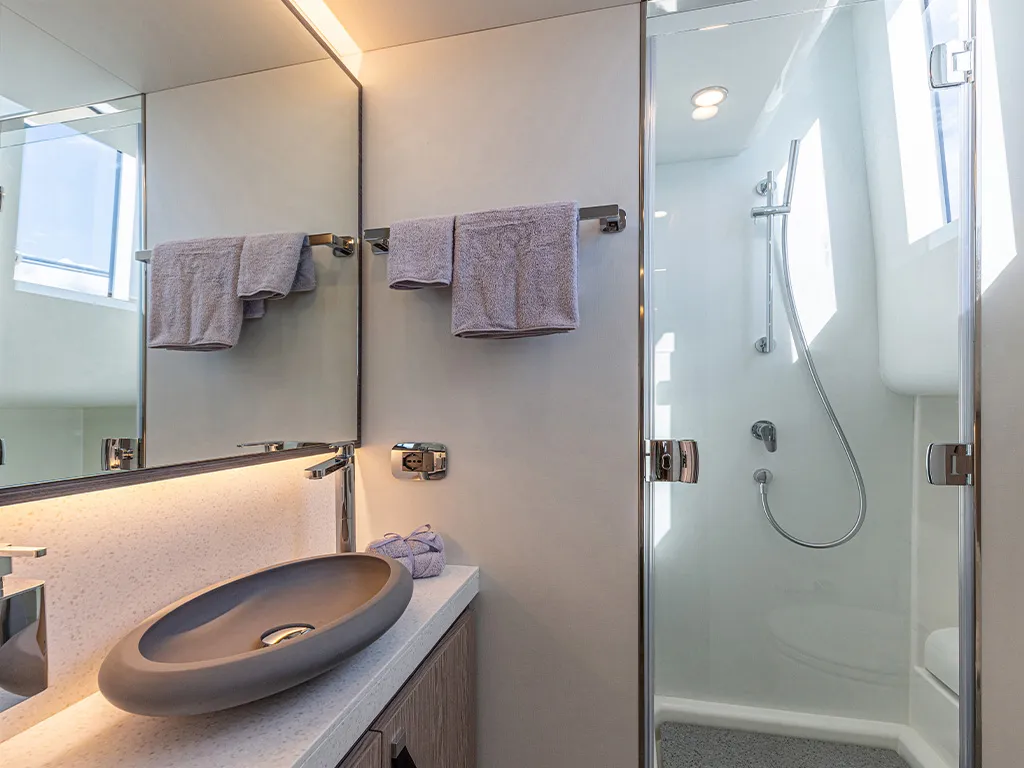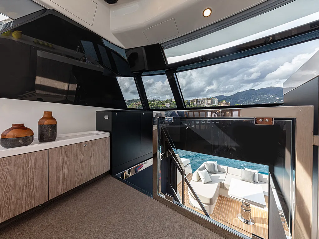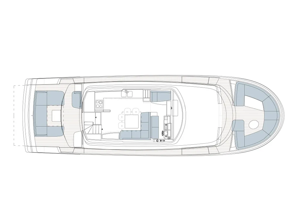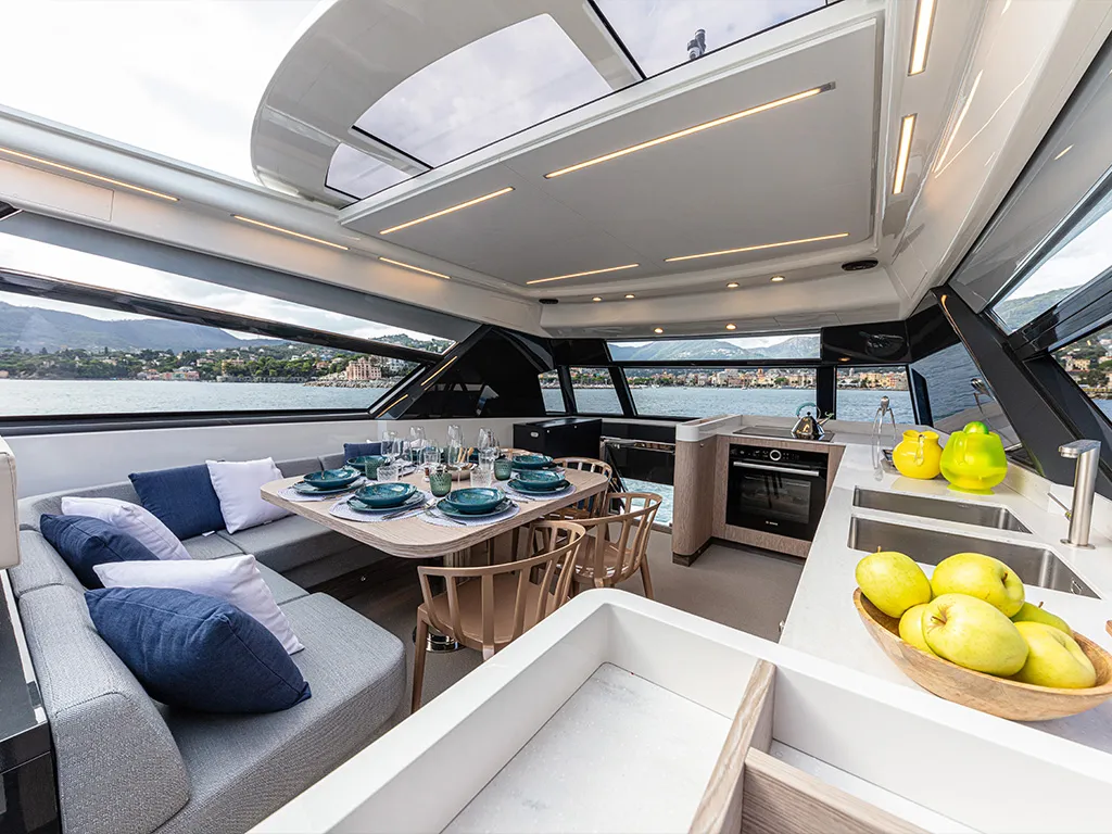 - Interior espacioso: El interior del Cetera 60 rezuma lujo y confort. Camarotes espaciosos, materiales de alta calidad y una distribución de las habitaciones bien pensada, con todos los camarotes en la cubierta principal, crean un ambiente acogedor para propietarios e invitados. El Cetera 60 puede equiparse con 3 ó 4 camarotes.