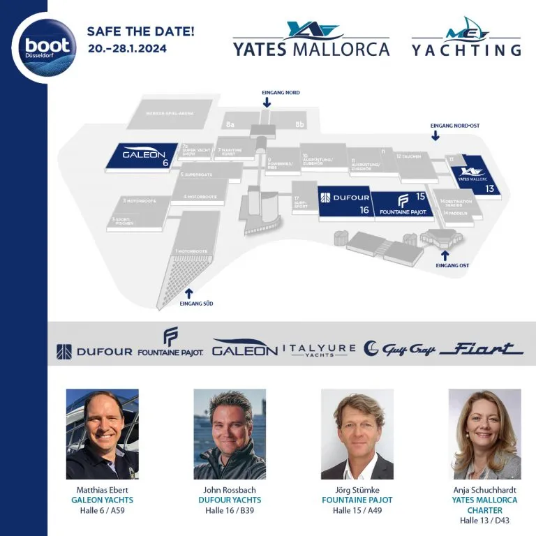 Encontrará nuestro stand de chárter de Yates Mallorca en el pabellón 13/D43, donde conocerá a Anja Schuchhardt, que estará encantada de informarle sobre nuestras novedades para la temporada de chárter 2024 y reservar sus vacaciones en atractivas condiciones de feria.