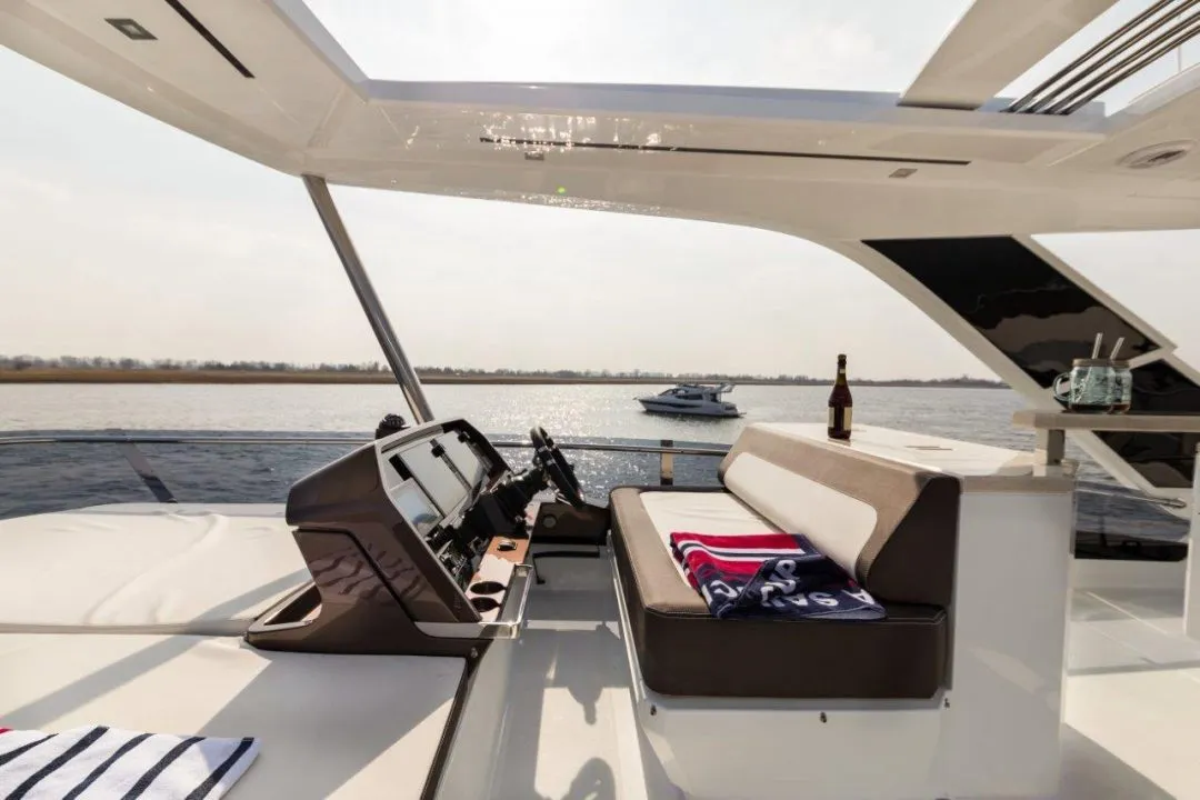 - ein Flydeck mit Außensteuerstand, komplett mit Essbereich, Bar und Lounge-Areal.