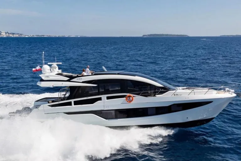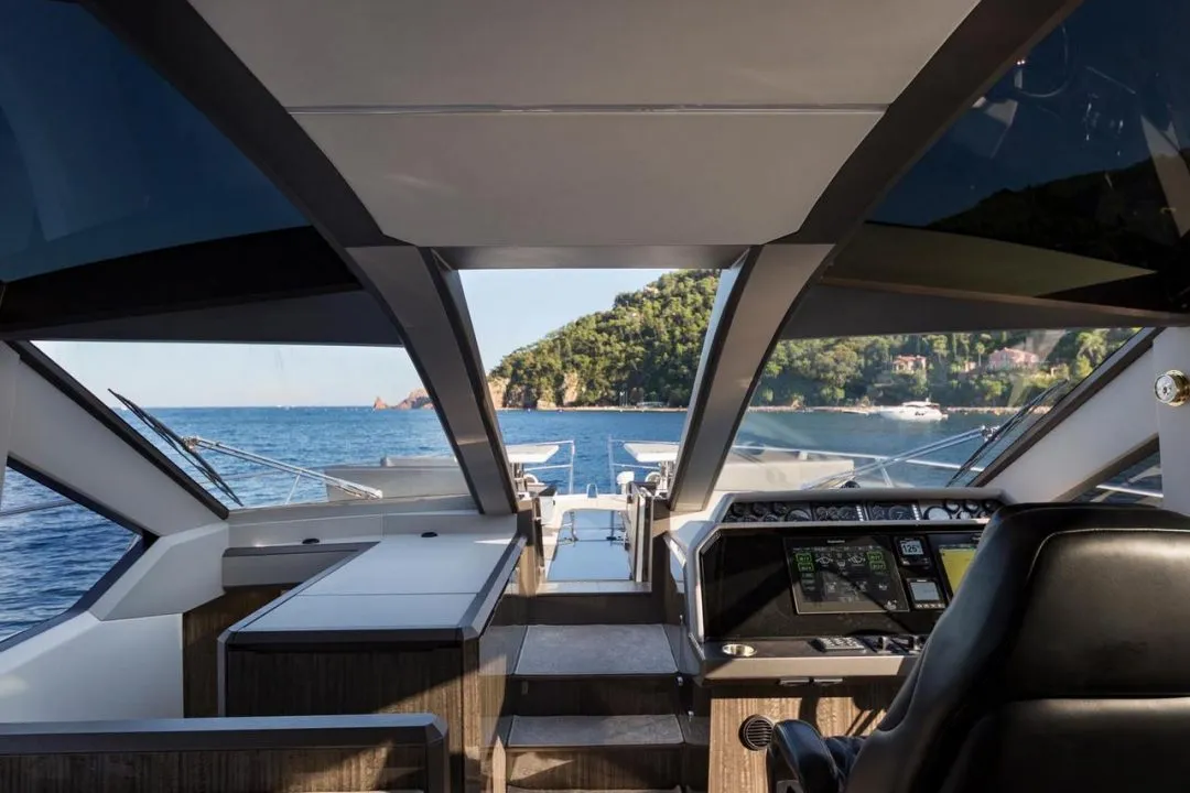 • ein Topdeck mit Außensteuerstand, drei Sportsitzen und Sonnenliege.
